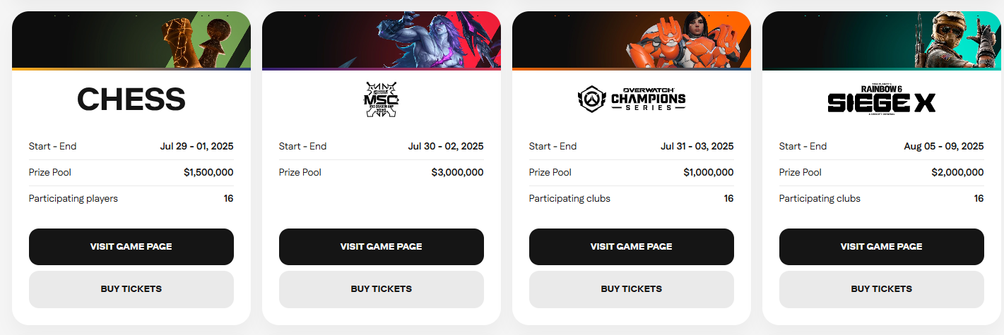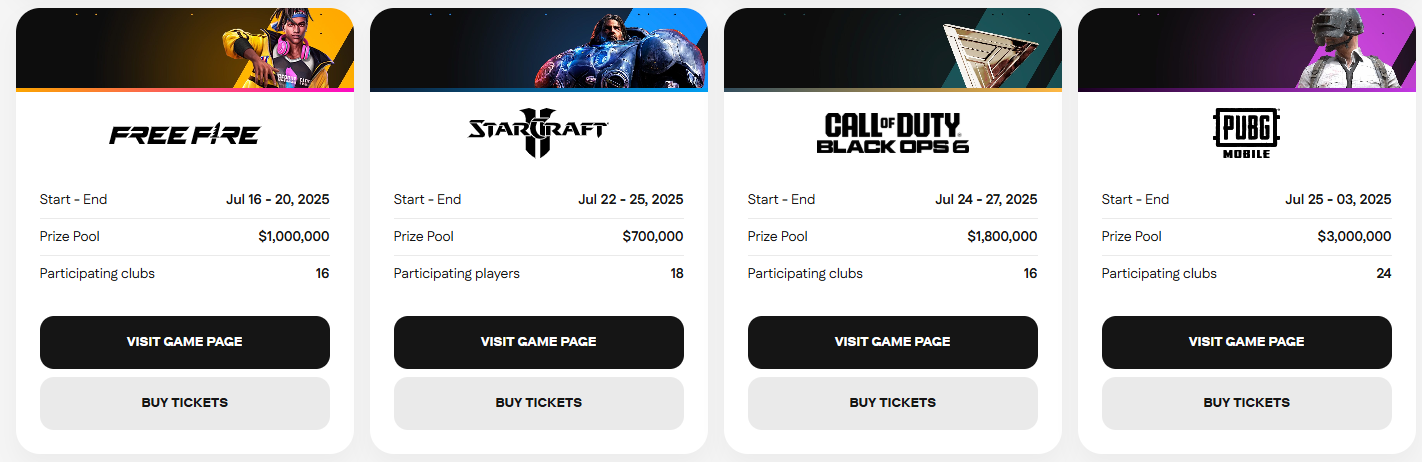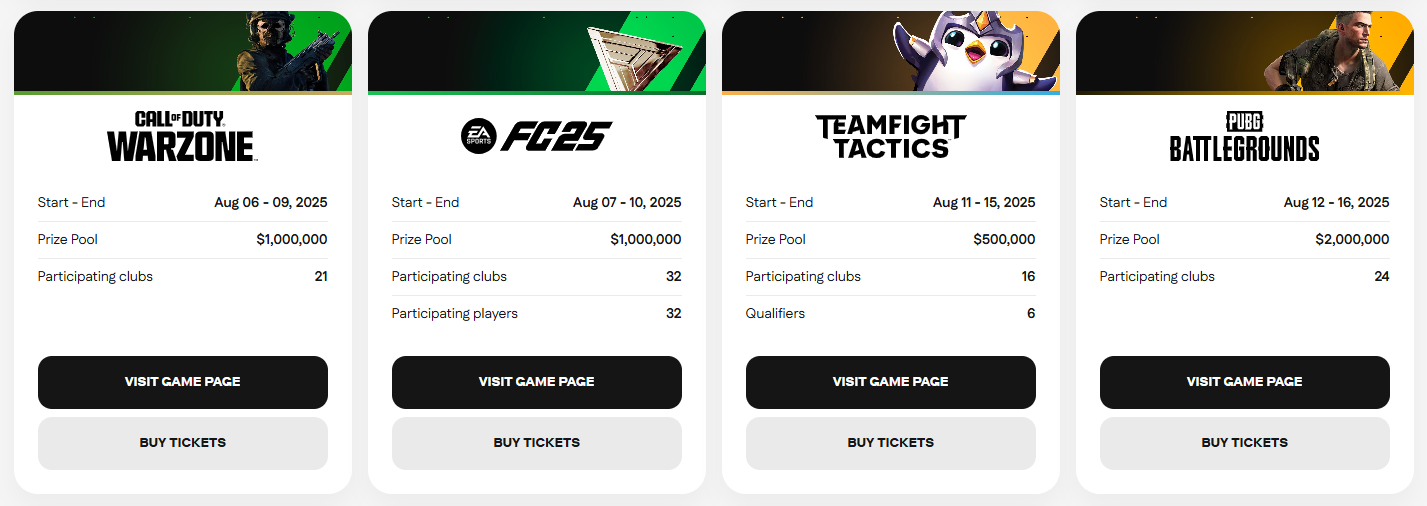 | 5주차 | 8/4(월)~8/10(일) | 콜 오브 듀티: 워존, 레인보우 식스 시즈 X, EA 스포츠 FC 25, 철권8, 전략적 팀 전투(TFT) | 콜 오브 듀티: 워존(8/10 일), 레인보우 식스 시즈 X(8/9 토) |