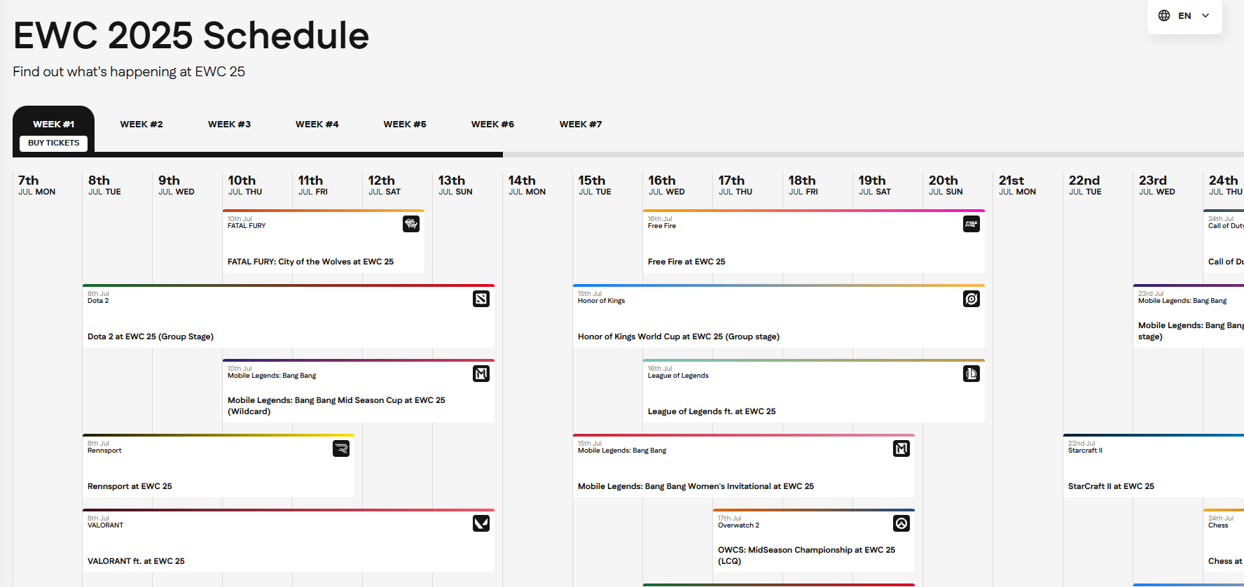 | 2주차 | 7/14(월)~7/20(일) | 리그 오브 레전드, 도타2, 모바일 레전드: 뱅뱅(여성), 아너 오브 킹즈, 프리 파이어, 스트리트 파이터6 | 리그 오브 레전드(7/20 일), 도타2(7/19 토) |