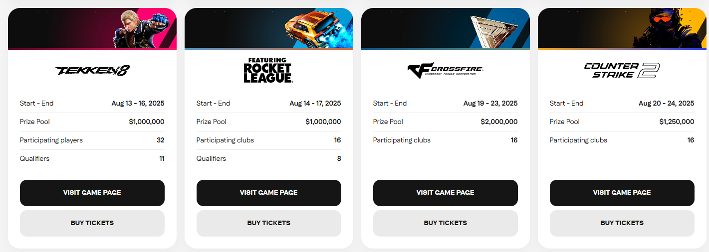 | 7주차 | 8/18(월)~8/24(일) | 카운터 스트라이크2, 크로스파이어, 스트리트 파이터6, EA 스포츠 FC 25, FIFAe 월드컵 | 카운터 스트라이크2(8/24 일), 스트리트 파이터6(8/23 토) |