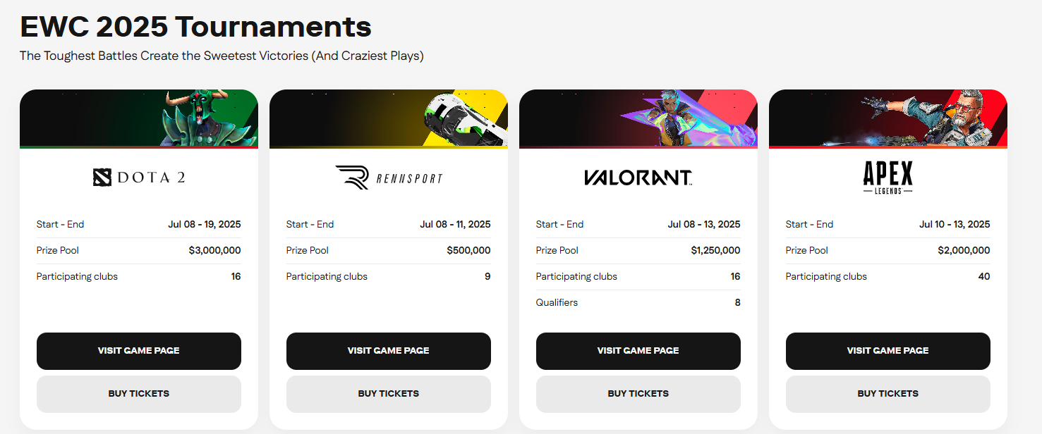 2025년 e스포츠월드컵이 7월 7일(월)~8월 24일(일) 사우디아라비아 리야드에서 역대 최대 규모로 개최됩니다. 총상금 7천만 달러, 25개 종목, 200개 이상 팀, 2,000명 이상의 선수가 참가하는 글로벌 축제! 발로란트, 리그 오브 레전드, 도타2, 스타크래프트2, 오버워치2 등 인기 게임부터 신작, 모바일, 격투, 스포츠, 레이싱까지 다양한 종목이 펼쳐집니다.